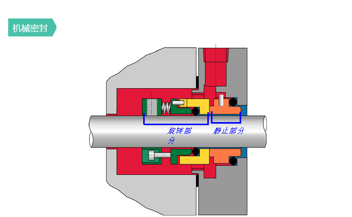 機封總是由旋轉部件(黃色部分)和靜止部件(橙色部分)兩大部分組成,兩相對運動的動,靜環面成為密封的主密封面。