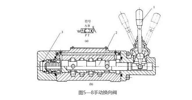 如果將該閥閥芯右端彈簧3的部位改為可自動定位的結(jié)構(gòu)形式,即成為可在三個位置定位的手動換向閥。圖5-8(a)為職能符號圖,(b)為結(jié)構(gòu)示意圖