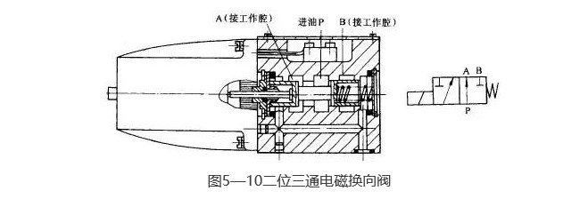 圖5—10為二位三通板式交流電磁換向閥的結(jié)構(gòu)和圖形符號圖。當電磁鐵通電時,即推動推桿將閥芯頂向右端;又當電磁鐵斷電時,閥芯在彈簧的作用下回到左端,從而實現(xiàn)了油路的換向。