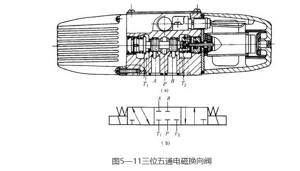 圖5-11所示為35D-25B型三位五通板式交流電磁換向閥的結(jié)構(gòu)和圖形符號圖。當左、右電磁鐵均斷電時,其閥芯在兩端彈簧的作用下處于中位(圖示位置);當左電磁鐵通電時,即推動推桿將閥芯頂向右端;當右電磁鐵通電時,即推動推桿將閥芯頂向左端,從而實現(xiàn)了油路的換向。
