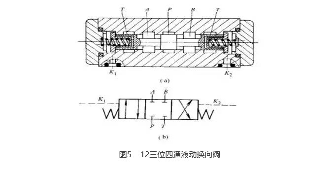 圖5-12所示為液動換向閥的結(jié)構(gòu)圖和圖形符號圖。當控制油口K1、K2均無控制壓力油通入時,閥芯在兩端彈簧作用下處于中位(圖示位置);當K1通入控制壓力油、K2通回油時,閥芯在液壓力作用下克服右端彈簧力移向右端;反之,當K2通控制壓力油、K1通回油時,閥芯被推向左端,從而實現(xiàn)了油路的換向。