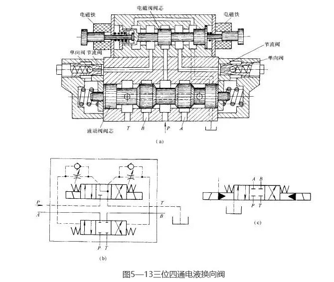圖5-13所示為電液換向閥的結(jié)構(gòu)圖和圖形符號圖。當電磁閥左端電磁鐵通電時,電磁閥閥芯被推向右端(左位接通),控制壓力油通過電磁閥流入液動閥閥芯的左端,推動液動閥閥芯向右移動,其右端的油液經(jīng)電磁閥回油箱,此時主油路P口與A口接通,B口與T口接通。反之,電磁閥右端電磁鐵通電時,控制壓力油經(jīng)電磁閥進入液動閥閥芯的右端,推動液動閥閥芯向左移動,其左端油液經(jīng)電磁閥回油箱,使主油路P口與B口接通,A口與T口接通。如電磁閥左、右電磁鐵均斷電,則電磁閥閥芯處于中位,控制壓力油被阻斷,不能進入液動閥,且因電磁閥的中位機能為Y型特性,使液動閥兩端的油液均經(jīng)電磁閥中位泄回油箱,因此液動閥也在其兩端彈簧的作用下處于中位,主油路P、T、A、B口均不相通。