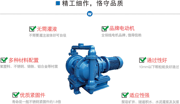 DBY 型電動(dòng)隔膜泵是 一種新型的泵類。本泵應(yīng)用于石化、陶瓷、冶金等行業(yè),這種泵的主要特點(diǎn)是不需灌引水。直徑 在10毫米以下的顆粒、泥漿等均可以毫不費(fèi)力地通過。由于隔膜將被輸送介質(zhì)和傳動(dòng)機(jī)械件分開,所以介質(zhì)不會(huì)向外泄漏,且泵本身無軸封,使用壽命大大延 長。根據(jù)不同介質(zhì),隔膜分為氯醇橡膠、氟橡膠、丁晴橡膠等,可以滿足不同用戶的要求。