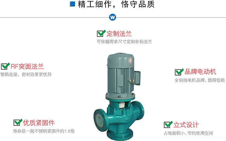 氟塑料管道泵又稱其為塑料管道泵、襯氟管道泵、四氟管道泵、耐腐蝕管道泵、襯塑管道泵、立式離心泵、立式管道泵,氟塑料管道泵是單吸單級離心泵的一種,因其進出口在同一直線上,且進出口口徑相同,仿似一段管道,可安裝在管道的任何位置故取名為管道泵(又名增壓泵)。氟塑料離心泵另有:IHF-D短支架型、IHF-L長支架型、FSB-D短支架型、FSB-L氟塑料離心泵。