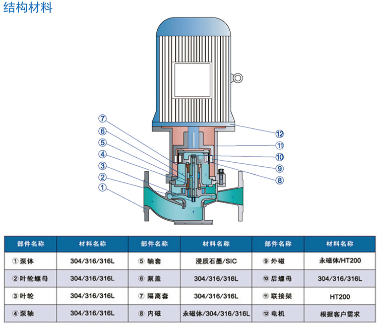 2、材質優(yōu)良,泵體、葉輪、隔離套等過流部件均采用優(yōu)質不銹鋼制造;
